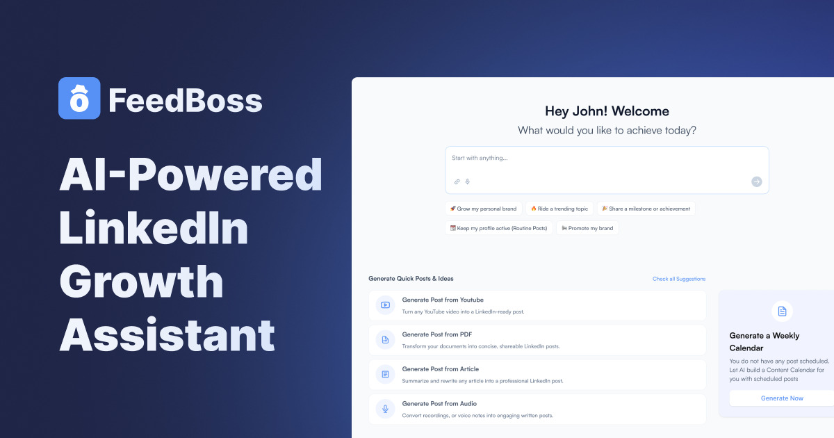 Feedboss is an AI-powered tool to grow your LinkedIn brand. Create content with AI assistant, schedule posts with one click, engage smarter, and track results with advanced analytics. Whether for personal branding, lead generation, or thought leadership, FeedBoss makes LinkedIn growth simple.