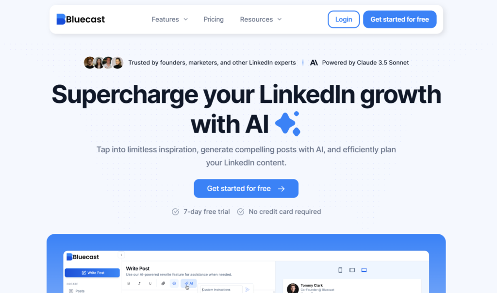 Got a YouTube video, blog article, podcast episode, or PDF report? Bluecast transforms it into LinkedIn-optimized posts and carousels. It doesn’t just pull quotes or create summaries.