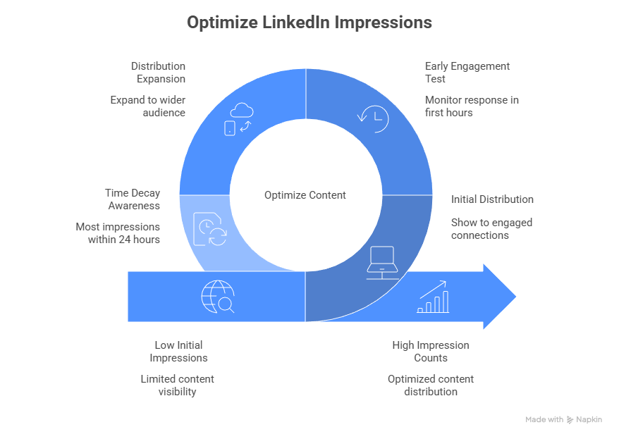 • Time decay: Most posts receive 70-80% of their total impressions within the first 24 hours. After 48 hours, impression rates drop significantly unless the post goes viral.